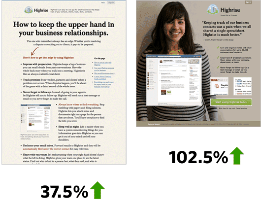 W kolejnej fazie jeszcze bardziej zmieniono podstronę oferty (wersja po prawej stronie poniższego screena). Wstawiono tam twarz uśmiechniętej osoby – Klientki, która chwaliła ofertę. Sam tekst oferty został natomiast maksymalnie skrócony. Co się okazało liczba Klientów wzrosła w stosunku do pierwszej wersji aż o 102,5%!