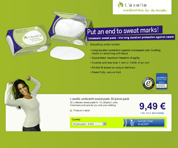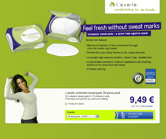 Firma L`axelle zmieniła tekst na stronie z ofertą (screen powyżej). Zamiast tekstu, który nastawiony był na cechy produktu związane z komfortem Klienta, wstawiony został tekst nastawiony na działanie. Zamiast wyrażeń typu „Poczuj się komfortowo”, użyto „Miej wszystko pod kontrolą”.
