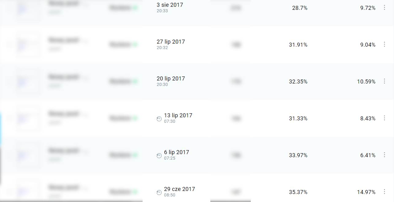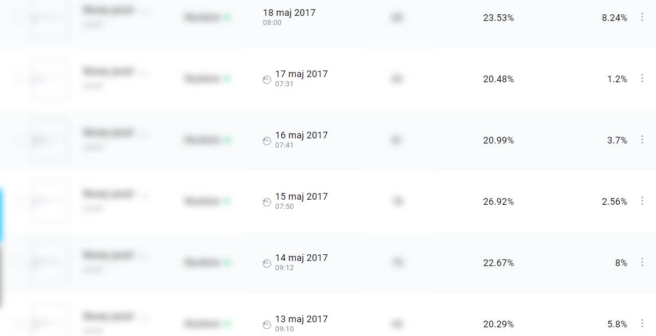 To statystyki z maja 2017, kiedy jedynie 20-25% osób z mojej listy w ogóle otwierało ode mnie maile. Ostatnia kolumna, to liczba osób, która klikała w maile. 1,2% w najgorszym przypadku. W kilku przypadkach dobijało do 8%.