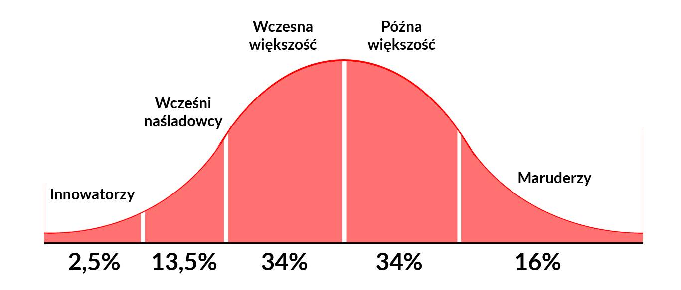 Dopiero po czasie dołączają kolejne osoby, takie jak wcześni naśladowcy innowatorów, później większość aż do spóźnialskich maruderów, którzy zaczynają korzystać z produktu u jego schyłku (chyba nie chcesz być w tej grupie?).