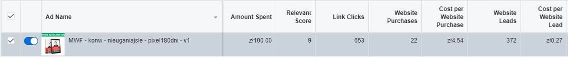 A tak powyższe podsumowanie wygląda w menadżerze reklam Facebooka.
