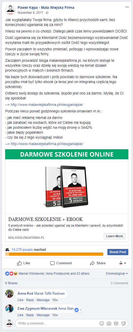 Najpierw zobacz jak wyglądał post, który reklamowałem na Facebooku.