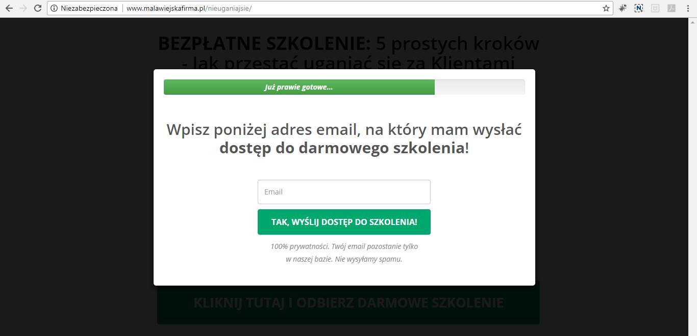 Dopiero po jego kliknięciu wyskakuje okienko z prośbą o podanie adresu email, na który ma zostać wysłane szkolenie oraz ebook. Znów powtarzam, że szkolenie jest darmowe.