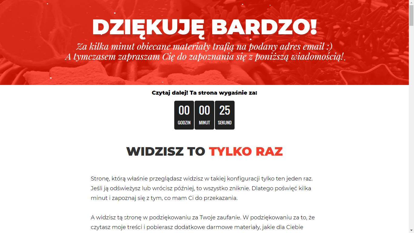 Dokładnie wyglądało to tak, że po przejściu poprzedniego kroku wyświetliła się strona z podziękowaniem, czyli komunikat: „Za kilka minut obiecane materiały trafią na podany adres email :) A tymczasem zapraszam Cię do zapoznania się z poniższą wiadomością!”