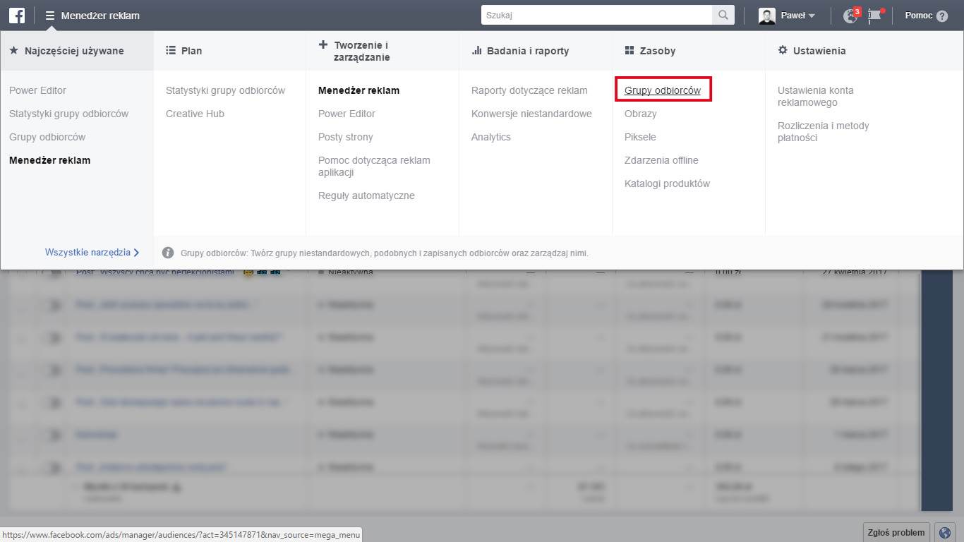 Kolejne kroki wykonujemy już w menadżerze reklam Facebooka, który znajdziesz tu: https://www.facebook.com/ads/manager. Rozwiń menu menadżera i wybierz tam opcję „Grupy odbiorców” (screen poniżej)