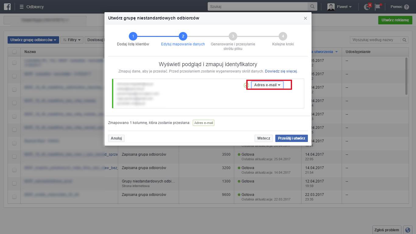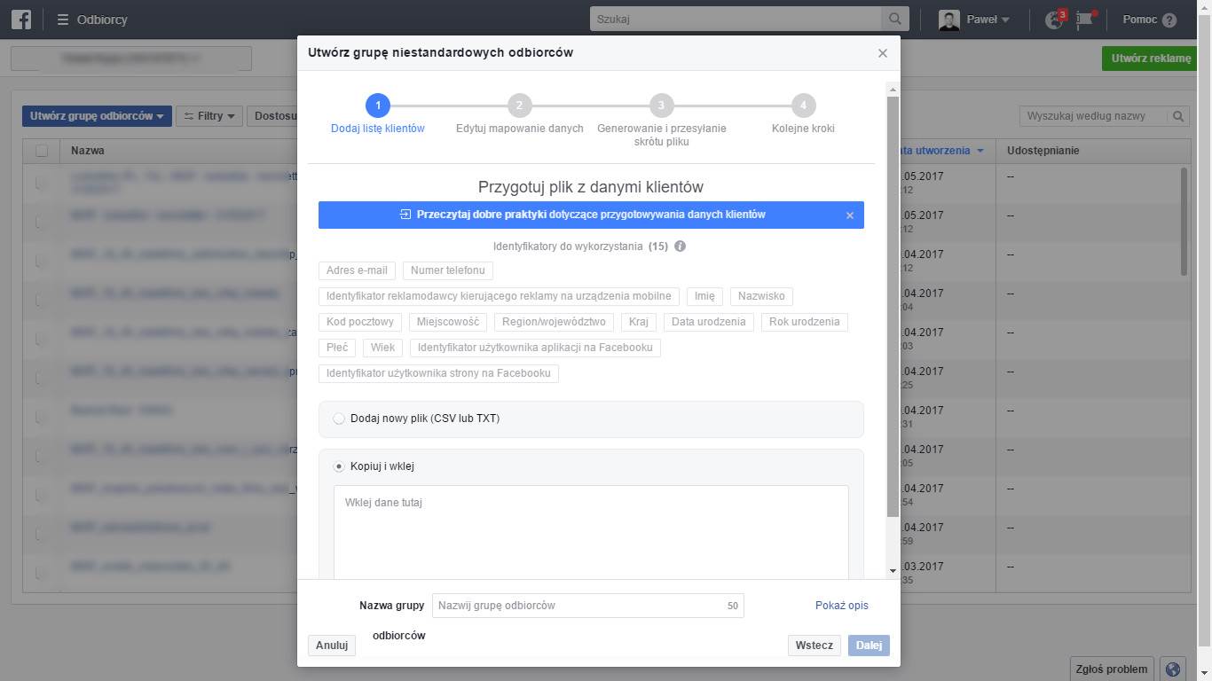 Przejdź od razu do pól zaznaczonych na szaro. Masz do wyboru – wgrać gotowy plik TXT (czyli z notatnika) lub CSV (w takim formacie możesz zapisać tabelkę z adresami email przygotowaną w Excelu). Jest też opcja „Kopiuj i wklej”. W tym przypadku skopiuj po prostu całą listę adresów z notatnika i wklej w to pole. W celach identyfikacyjnych pozostaje Ci tylko nadać nazwę tak stworzonej grupie. Możesz ją nazwać skrótem firmy, nazwą bazy i dzisiejszej daty, czyli np. jeśli prowadzę salon kosmetyczny, to moja nazwa będzie brzmieć „SF – klientki – 02.06.2017”. Zawsze dodaję datę, tak aby wiedzieć kiedy z danej grupy mogę korzystać. Jeśli na Twojej liście pojawią się nowe adresy email, stwórz nową grupę odbiorców niestandardowych a następnie grupę lookalike.