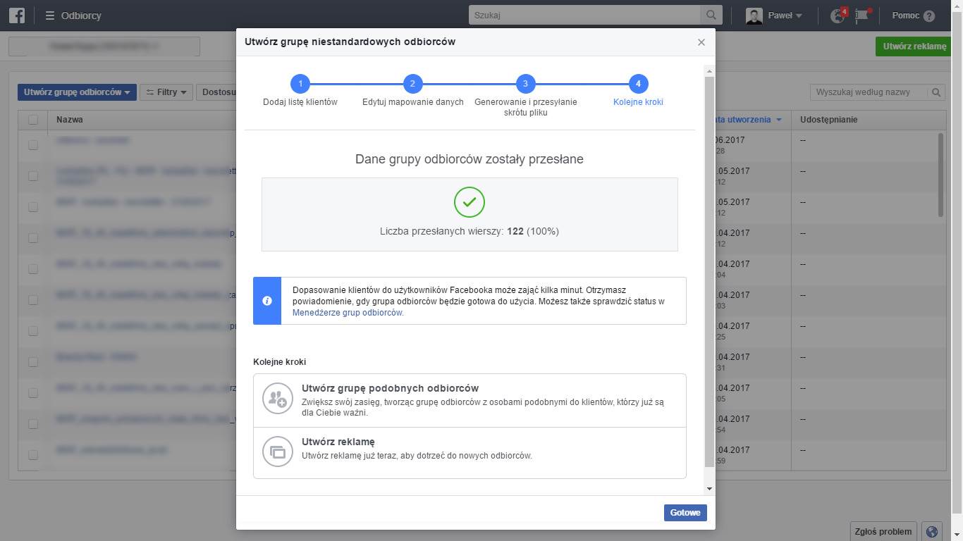 Facebook ponownie analizuje przesłane dane i tworzy grupę. Przez ten czas przy jej nazwie widzisz czerwoną kropkę i status „Niegotowa”. Uzbrój się w cierpliwość. Jak tylko grupa będzie gotowa, możesz zacząć z niej korzystać i kierować tam swoje reklamy.