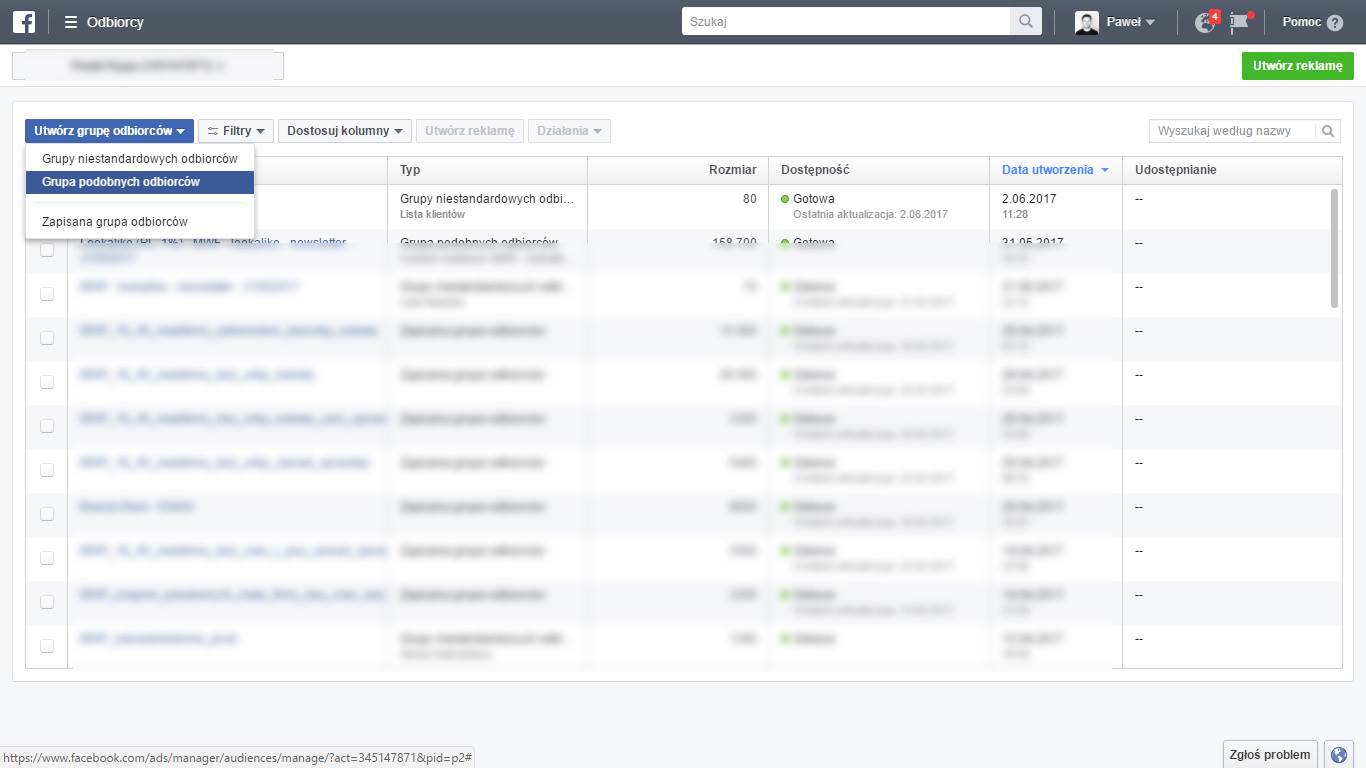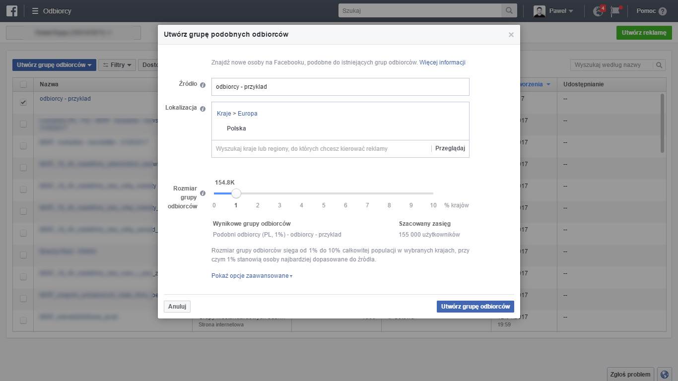 Twoja grupa może zawierać pomiędzy 1 a 10% osób z tych 15,5 miliona. Na początek zacznij od 1%. Uzyskasz dzięki temu grupę 1% mieszkańców Polski, najbardziej pasujących do Twoich Klientów. Wielkość tej grupy w tym przypadku wynosi 155 tysięcy osób. To sporo jak na warunki naszego kraju. W USA, gdzie aktywnych jest ponad 200 milionów użytkowników, 1% wyniesie nieco ponad 2 miliony potencjalnych odbiorców. Wszystko zależy więc od lokalizacji. Nie pozostaje Ci nic innego jak kliknąć przycisk „Utwórz grupę odbiorców” u dołu okienka.